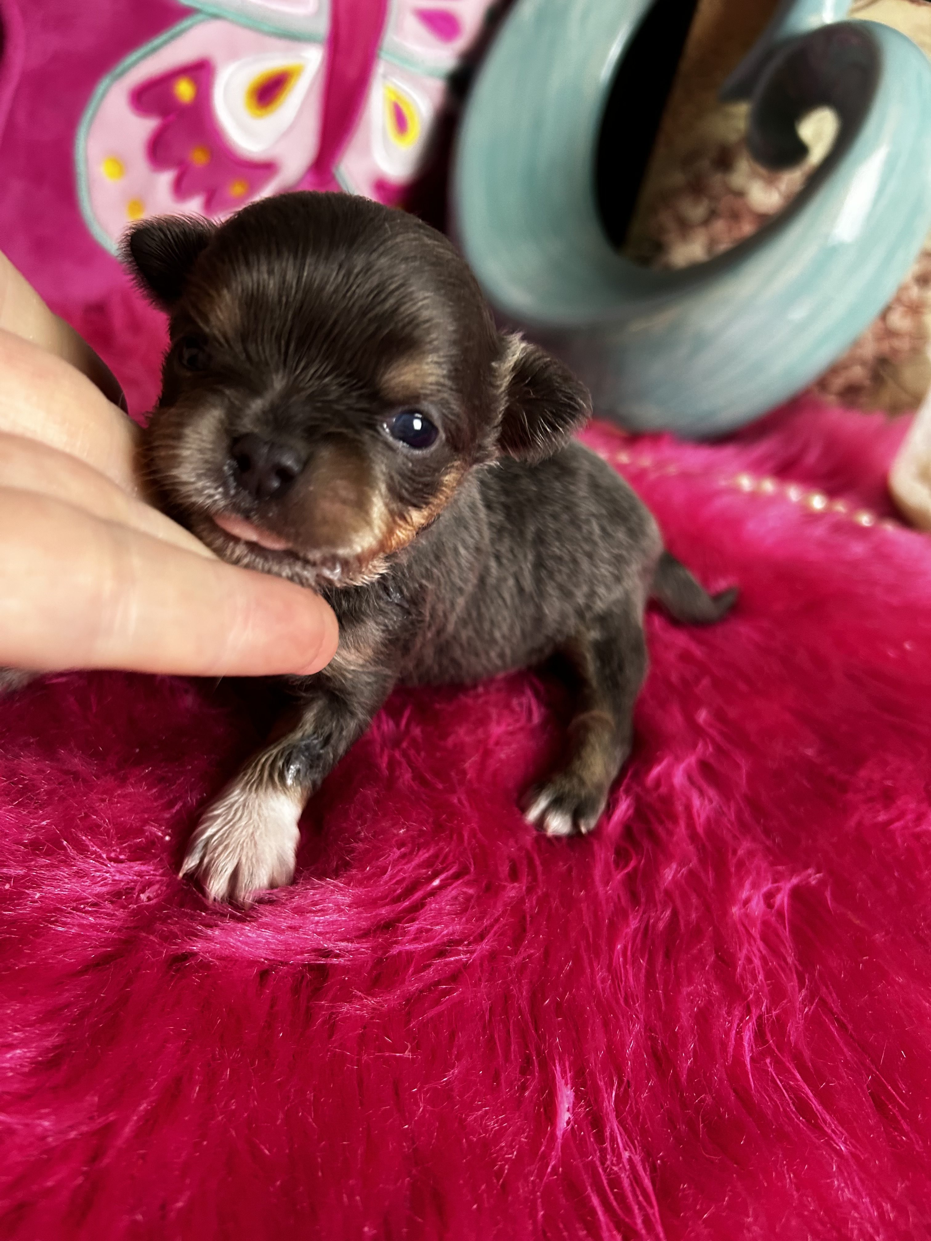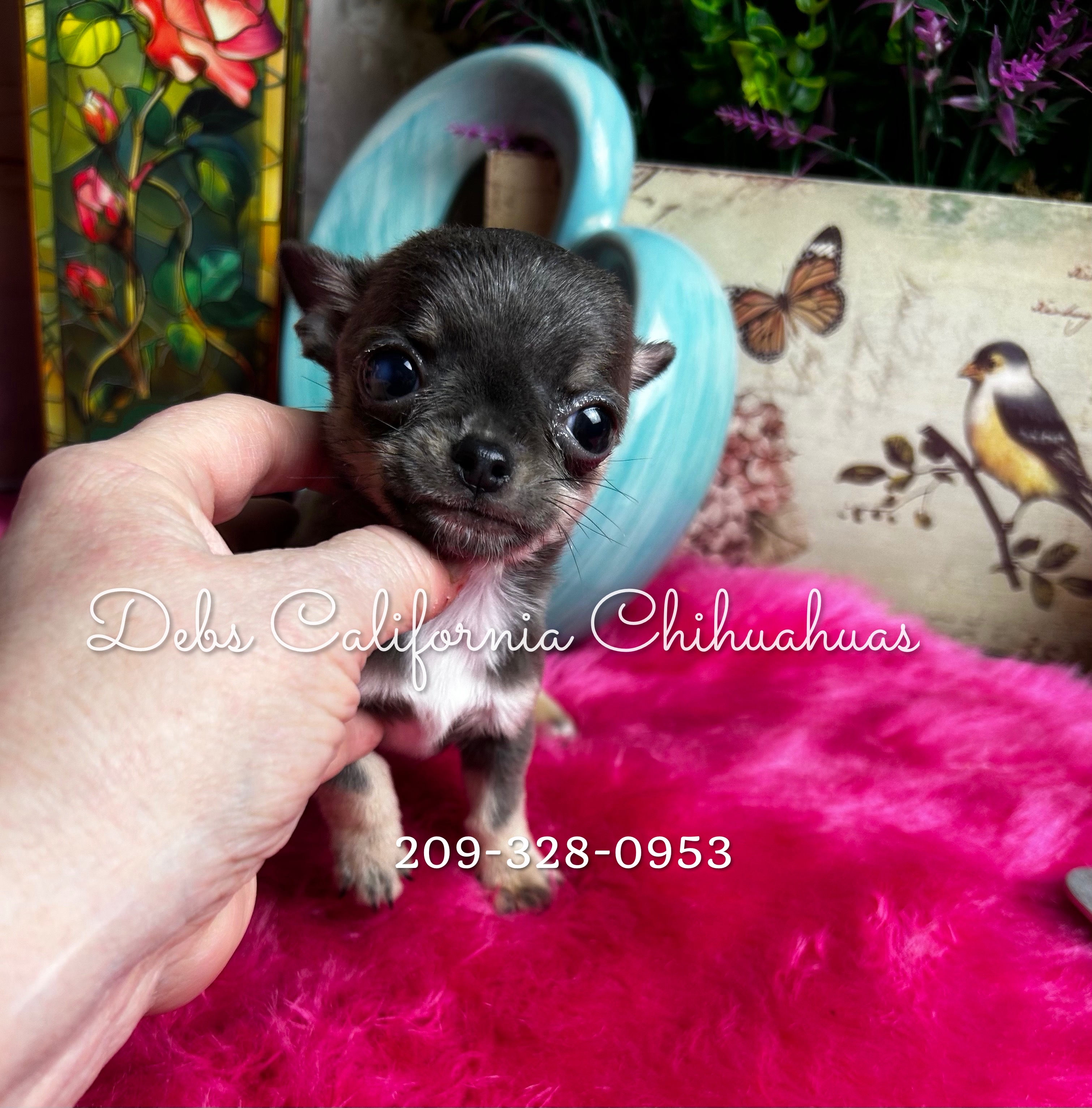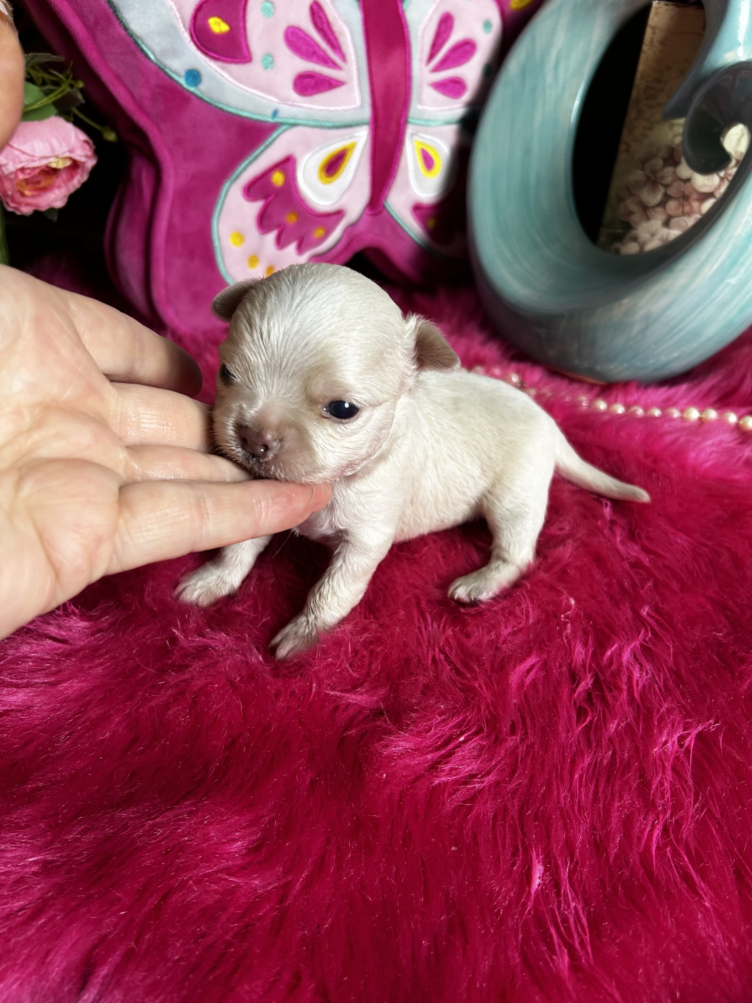 Blue Merle shorthair dollfaced little girl, big eyes, adorable, Charts 3.75 to 4 lbs grown. Puppy comes with 30 day free insurance, gift bag of goodies, pet reg, pedigree, shot record.